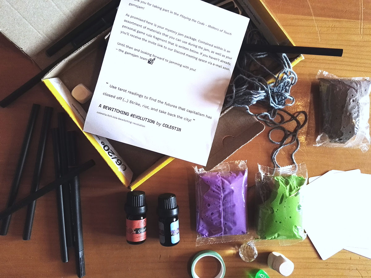 Playing the Code / Matters of Touch was a game jam that took place in an online meeting space from the 14th to the 16th of September 2020. A game jam is a get-together with a set timeframe and sometimes a topic to think up and make a game around. We worked collaboratively to make our own physical games by using an assortment of playful materials that were mailed to each participant’s home in a randomized package.